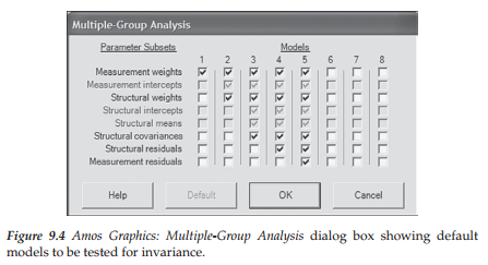 Recall that in Chapter 7, we tested separately for the validity of the multigroup configural model, followed by tests for invariance related separately to each of the measurement and structural models. As noted in Chapter 7 and illustrated in Chapter 8, these tests can be tested simultaneously using the Amos automated procedure. In the present chapter, we expand on this model-testing process by including both the structural residuals (i.e., error residual variances associated with the dependent factors in the model) and the measurement residuals (i.e., error variances associated with the observed variables). A review of the Multiple-Group Analysis dialog box, shown in Figure 9.4, summarizes the parameters involved in testing for the invariance of these five models. As indicated by the gradual addition of constraints, these models are cumulative in the sense that each is more restrictive than its predecessor.