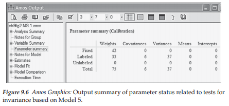 Turning next to Figure 9.6, we find the summary of parameters associated with the cumulative series of tests for these five models showing the breakdown pertinent to each model tested. In essence, the categorization of parameters presented in the summary is specific to Model 5. Let’s now dissect this summary in order that you have a clear understanding of what each of these numbers represents and how each was derived; recall that a parameter categorized as “labeled” represents one that is constrained equal across groups. A breakdown of this parameter summary is as follows: