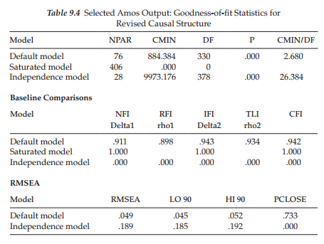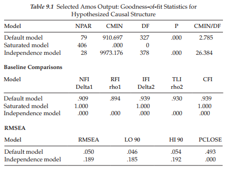 In Table 9.5, I present findings related to the five models checkmarked by default in Amos 23 primarily for the educative purpose of showing