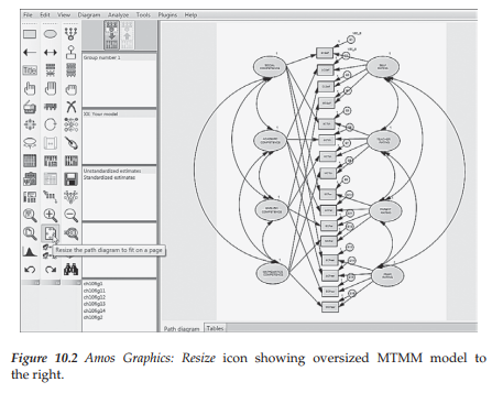 Before launching into a discussion of this model, I consider it worthwhile to take a slight diversion in order to show you an option in the Amos toolbar that can be very helpful when you are working with a complex model that occupies a lot of page space such as we have here. The difficulty with the building of this model is that the double-headed arrows extend beyond the drawing space allotted by the program. In Figure 10.2, however, I illustrate how you can get around that problem simply by clicking on the Resize icon identified with the cursor as shown to the left of the model. Clicking on this tool will immediately resize the model to fit within the page perimeter.