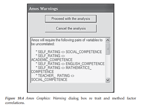 Second, note in Figure 10.1 that all trait (Social Competence to Mathematics Competence) and method (Self-Rating to Peer Rating) covariances are freely estimated. Importantly, however, you will see that covariances among traits and methods have not been specified (see Note 1). Let’s turn now to the test of this correlated traits-correlated methods (CT-CM) model. Immediately upon clicking on the Calculate icon (or drop-down menu), you will be presented with the dialog box shown in Figure 10.4, which lists a series of covariance parameters and warns that these pairs must remain uncorrelated. In fact, the parameters listed represent all covariances between trait and method factors, which I noted earlier in this chapter cannot be estimated for statistical reasons. Thus we can proceed by clicking on the Proceed with the Analysis tab.3