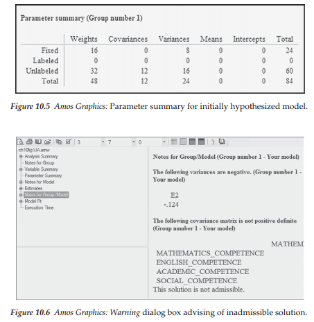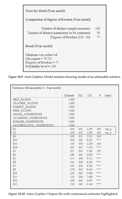 The next critically important result reported in the output file is an alert message in the “Notes for Group/Model” file as shown in Figure 10.6. This message advises that the variance of error term E2 is negative, thereby resulting in a covariance matrix that is not positive definite, and at the bottom that the solution is not admissible. Indeed, a review of the estimates for this solution confirms that the variance associated with the error term E2 is negative.