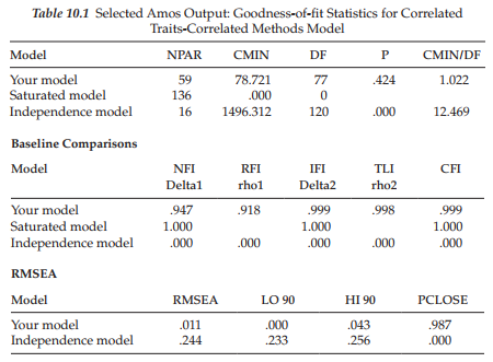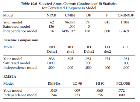 We turn now to selected sections of the Amos output file pertinent to this correlated uniquenesses model. In reviewing Table 10.6, we see that this model represents an excellent fit to the data (x2(74) = 96.473; CFI = .984; RMSEA = .040, 90% C.I. = .009, .060). Furthermore, consistent with past reported results (e.g., Kenny & Kashy, 1992; Marsh & Bailey, 1991), this solution resulted in no problematic parameter estimates.