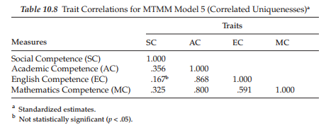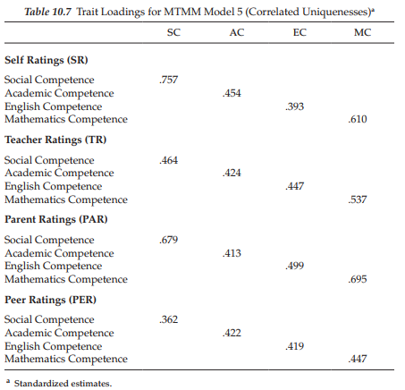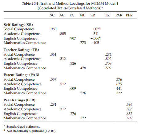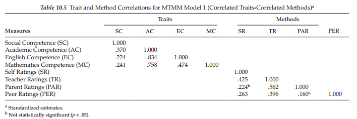Finally, an examination of method factor correlations in Table 10.5 reflects on their discriminability, and thus on the extent to which the methods are maximally dissimilar; this factor is an important underlying assumption of the MTMM strategy (see Campbell & Fiske, 1959). Given the obvious dissimilarity of self, teacher, parent, and peer ratings, it is somewhat surprising to find a correlation of .562 between teacher and parent ratings of competence. One possible explanation of this finding is that, except for minor editorial changes necessary in tailoring the instrument to either teacher or parent as respondents, the substantive content of all comparable items in the teacher and parent rating scales were identically worded; the rationale here being to maximize responses by different raters of the same student.