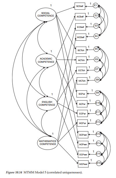 In reviewing the model depicted in Figure 10.14, you will note that it embodies only the four correlated trait factors; in this aspect only, it is consistent with the CT-CM model shown in Figure 10.1. The notably different feature about the CT-CU model, however, is that although no method factors are specified per se, their effects are implied from the specification of correlated error terms (the uniquenesses)5 associated with each set of observed variables embracing the same method. For example, as indicated in Figure 10.14, all error terms associated with the self-rating measures of Social Competence are correlated with one another. Likewise, those associated with teacher, parent, and peer ratings are intercorrelated.
