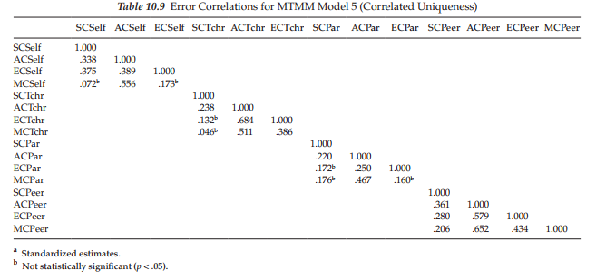 Method effects in the CT-CU model are determined by the degree to which the error terms are correlated with one another (Kenny & Kashy, 1992). In contrast to Model 1, there is no assumption that the method factor remains the same for all measures embracing the same method. Rather, as Kenny and Kashy (1992, p. 169) explain, “In the Correlated Uniquenesses model, each measure is assumed to have its own method effect, and the covariances between measures using the same method assess the extent to which there is a common method factor.” In other words, as Kenny and Kashy further note, whereas the general CFA MTMM model assumes that method effects are invariant across traits, the CT-CU model allows for the multidimensionality of method effects. (For critiques of these effects, see Conway et al., 2004; Lance et al., 2002; for an attempt to understand the substance of these correlated error terms, see Saris & Aalberts, 2003.) It is interesting to see in Table 10.9, that the strongest method effects are clearly associated with teacher and peer ratings of the three academic competencies, and with parent ratings of only Mathematics Competence. Indeed, from a substantive standpoint, these findings at least for the teacher and peer ratings certainly seem perfectly reasonable. On the other hand, the strong method effects shown for parent ratings involving relations between academic and math competencies is intriguing. One possible explanation may lie in the fact that when parents think “academic competence,” their thoughts gravitate to “math competence.” As such, academic competence appears to be defined in terms of how competent they perceive their son or daughter to be in math.