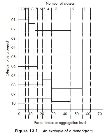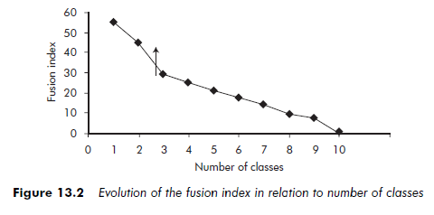 Figure 13.1 shows an example of a dendogram. We can see that the objects that are the closest, and are the first to be grouped together, are objects 09 and 10. Aggregations then occur reasonable regularly, without any sudden rises, until the number of classes has been reduced to three. However, when we pass from three classes to two (see arrow on Figure 13.2), there is a big ‘leap’ in the fusion index (see the arrow on the graph). The conclusion is that three classes should be kept.
