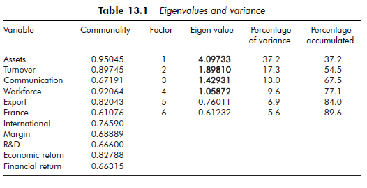 Table 13.1 presents the results of a factor analysis. Eleven variables characterizing 40 firms were used in the analysis. For each variable, communality represents the share of common variance. The first six factors are examined in the example. According to the Kaiser rule, only the first four factors must be retained (they have an eigenvalue of more than 1). In total, these first four factors reproduce 77.1 per cent of the total variance.