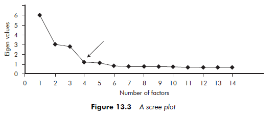 The eigenvalues are classified in decreasing order and any definite leveling- out of the curve is noted. The number of factors to include is then the number corresponding to the point where this leveling-out begins. Factor analysis software packages can generate a graphic visualization – called a ‘scree plot’ or a ‘scree test’ – of eigenvalues, which facilitates detection of such leveling. Figure 13.3 shows an example of a ‘scree plot’. It represents the eigenvalues of the first 14 factors resulting from a CA. We note that, after the fourth factor, the eigenvalues stabilize (see arrow on Figure 13.3). The number of factors to retain is, therefore, four.