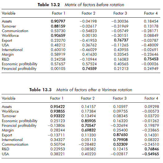 Table 13.3 presents the matrix of factors after a Varimax rotation. One can conclude that the variables ‘assets’, ‘workforce’ and ‘turnover’ are always strongly and essentially loaded to Factor 1. The variables ‘economic profitability’, ‘financial profitability’ and ‘margin’ seem to be strongly and essentially loaded to Factor 2. The variables ‘export’ and ‘international’ as well as, to a lesser degree, the variable ‘communication’, are strongly and essentially loaded to Factor 3. Finally, the variable ‘R&D’ and, to a lesser degree, the variable ‘USA’ are strongly and essentially loaded to Factor 4. In conclusion, the interpretation of the factors is simplified: Factor 1 represents ‘size’, Factor 2 ‘profitability’, Factor 3 ‘internationalization policy’ and Factor 4 ‘research and development policy’.