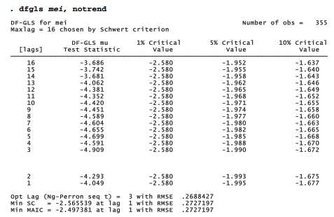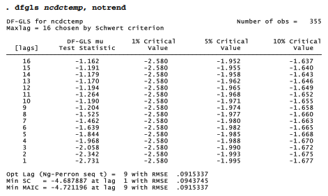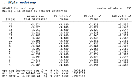 The dfgls output above reports tests of the nonstationary null hypothesis — that the temperature series represents a random walk, or has a unit root — for lags from 1 to 16 months. At the bottom, the output offers three different methods for choosing an appropriate number of lags: Ng-Perron sequential t, minimum Schwarz information criteria, and Ng-Perron modified