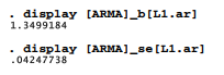 After we fit an arima model, these estimates and other results are saved temporarily in Stata’s usual way. For example, to see the model’s AR(1) coefficient and standard error, type