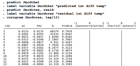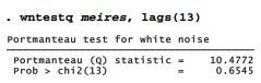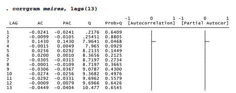 corrgram’s portmanteau Q tests find no significant autocorrelation among residuals out to lag 13, apart from one just below the .05 level at lag 3. We could obtain the same test for any specific lag using a wntestq command, such as