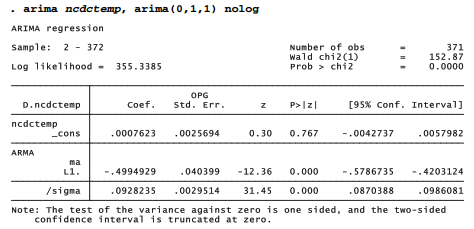 where y trepresents ncdctemp at time t. Parameter estimates are p0 = .00076 and d= -.499. The first-order MA term, d, is statistically significant (p ~ 0.000), and the model’s residuals are indistinguishable from white noise.