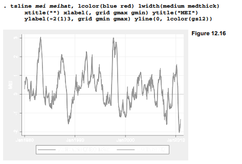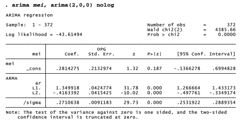We have seen that autocorrelations for mei damp out gradually with increasing lag (Figure 12.14), while partial autocorrelations cut off after lag 2. These correlogram patterns, together with dfgls test results supporting stationarity, suggest that mei could be modeled as an ARIMA(2,0,0) process.