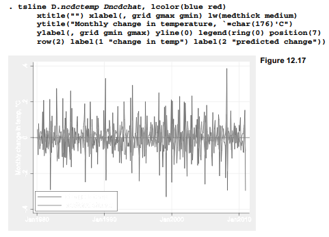 Although these tests give no reason to discard our ARIMA(0,1,1), the month-to-month changes in global temperature anomaly prove relatively hard to predict. Figure 12.17 employs the difference operator D. in a graph command to show the unimpressive fit between observed and predicted values. This model explains only about 20% of the variance in monthly differences.