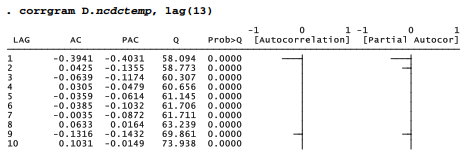 corrgram’s portmanteau Q tests find no significant autocorrelation among residuals out to lag 13, apart from one just below the .05 level at lag 3. We could obtain the same test for any specific lag using a wntestq command, such as