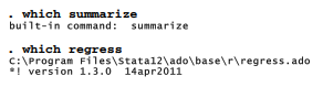 This distinction makes no difference to most users, because summarze and regress work with similar ease when called. Studying examples and borrowing code from Stata’s thousands of official ado-files can be helpful as you get started writing your own. The which output above gave the location for file regress.ado. To see its actual code, type