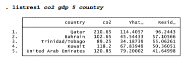 Next, we use the newly-defined listresl command, followed by its four arguments. The first argument specifies the y variable, the second x, the third how many observations to list, and the fourth gives the case identifier. In this example, our command asks for a list of observations that have the five largest absolute residuals.