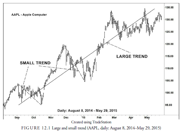 Any particular trend is influenced by its next larger and next smaller trend. For example, in Figure 12.1, we can see a well-defined uptrend in the stock of AAPL (Apple Computer). It is not a straight line upward, however. Within the rising trend are many smaller trends, both down and up, and if we look more closely, there are even smaller down- and uptrends within these. This is the fractal nature of trends. Notice also that the next set of trends below the long uptrend have larger rises and smaller declines. This is the effect the larger trend is having on the smaller trends. It is why the analyst, when studying any particular length trend, must be aware of the next longer and shorter trend directions. The longer trends will influence the strength of the trend of interest, and the shorter trends will often give early signs of turning in the longer. By definition, short-term trends reverse before medium-term, and medium-term trends reverse before long-term.