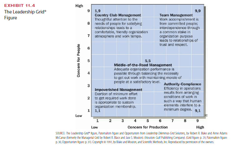 Building on the work of the Ohio State and Michigan studies, Blake and Mouton of the University of Texas proposed a two-dimensional leadership theory called the leadership grid.23 The two-dimensional model and five of its seven major management styles are depicted in Exhibit 11.4. Each axis on the grid is a nine-point scale, with 1 mean- ing low concern and 9 high concern.