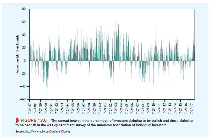 Behavioral economists stress the importance of investor sentiment in determining stock prices, and they point to evidence of major swings in sentiment. For example, every week the American Association of Individual Investors surveys its members and asks them whether they are bullish, bearish, or neutral on the stock market over the next six months. Anyone who believed that all the good or bad news was already reflected in stock prices would tick the neutral box. But you can see from Figure 13.6 that private investors swing quite strongly between being bullish or bearish. In January 2000, at the height of the dot-com boom, a massive 75% of investors said they were bullish, 62% more than claimed to be bearish. Perhaps these periods of bullishness and bearishness may explain the short-term momentum effect that we commented on earlier.