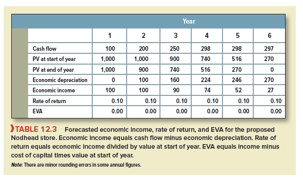It is not hard to forecast economic income and rate of return for the Nodhead store. Table 12.3 shows the calculations. From the cash-flow forecasts we can forecast present value at the start of periods 1 to 6. Cash flow minus economic depreciation equals economic income. Rate of return equals economic income divided by start-of-period value.