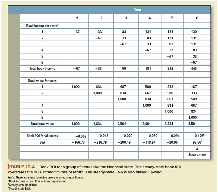 It turns out that the errors do not wash out in the steady state. Table 12.4 shows steady-state book ROIs and EVAs for the supermarket chain if it opens one store a year. For simplicity, we assume that the company starts from scratch and that each store’s cash flows are carbon copies of the Nodhead store. The true rate of return on each store is, therefore, 10% and the true EVA is zero. But as Table 12.4 demonstrates, steady-state book ROI and estimated EVA overstate the true profitability.