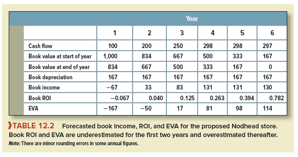 Table 12.2 shows the store’s forecasted book profitability, assuming straight-line depreciation over its six-year life. The book ROI is lower than the true return for the first two years and higher afterward.[1] EVA also starts negative for the first two years, then turns positive and grows steadily to year 6. These are typical outcomes, because accounting income is too low when a project or business is young and too high as it matures.