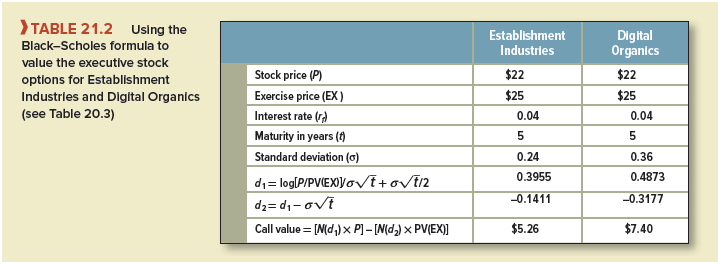 Speaking of executive stock options, we can now use the Black-Scholes formula to value the option packages you were offered in Section 20-3 (see Table 20.3). Table 21.2 calculates the value of the options from the safe-and-stodgy Establishment Industries at $5.26 each. The options from risky-and-glamorous Digital Organics are worth $7.40 each. Congratulations.