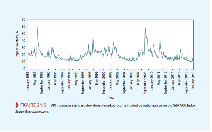 The Chicago Board Options Exchange regularly publishes the implied volatility on the Standard and Poor’s index, which it terms the VIX (see the nearby box on the “fear index”). There is an active market in the VIX. For example, suppose you feel that the implied volatility is implausibly low. Then you can “buy” the VIX at the current low price and hope to “sell” it at a profit when implied volatility has increased.
