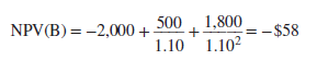 Project B also requires an initial investment of $2,000 but produces a cash inflow of $500 in year 1 and $1,800 in year 2. At a 10% opportunity cost of capital project B has an NPV of -$58:
