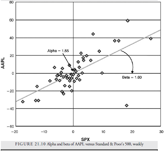 The graph in Figure 21.10 shows the scatter plot of weekly changes in AAPL (Apple Computer stock) and the S&P 500 index. The linear regression line through the scatter plot can be defined by its beta (1.60) and its alpha (1.55). Beta represents how volatile AAPL is relative to the S&P. AAPL’s beta of 1.6 implies that AAPL stock will, on average, move 60% more than the S&P 500 on a weekly basis. The alpha of 1.55 indicates that AAPL has been outperforming the S&P by 1.55% on average over the 52 weeks in the plot. It thus has a positive alpha and is a strong stock. Comparing AAPL’s alpha to that of other stocks is a way to determine the strongest and best candidates for investment. For a more thorough explanation of linear regression, see Appendix A, “Basic Statistics.”