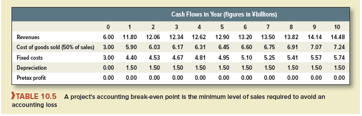 Should Otobai’s manager be relaxed if the project breaks even each year in accounting terms? It is true that its revenues will then be sufficient to cover the operating costs and repay the initial investment. But they will not be sufficient to repay the opportunity cost of capital on that ¥15 billion. A project that breaks even in accounting terms will surely have a negative NPV.