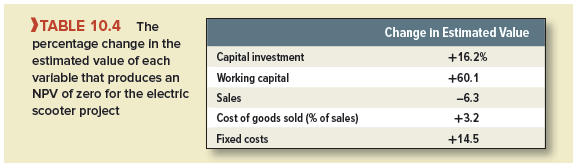 Table 10.4 shows the break-even points for each of the other variables. You can see, for example, that quite small errors in your forecasts for unit sales, price, and variable costs could cause your project to become a loser. On the other hand, the project would still break even (NPV = 0) if you have underestimated working capital by 60.1%.