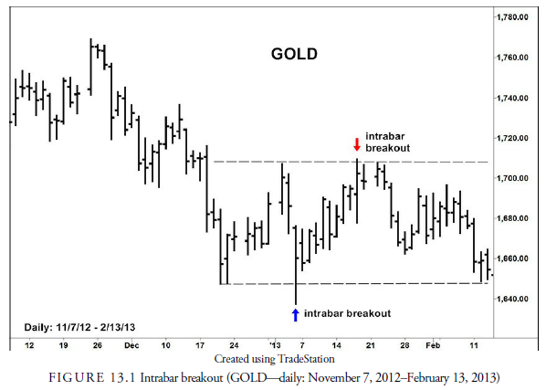 When the exact breakout level is not clear, as in a support or resistance zone, the extreme level of the zone is considered the breakout level. For example, in a trading range with a wide support zone of horizontal lines from previous support points, the lowest support line would be the breakout level. The other horizontal lines are also parts of the zone, but prices will often recede into the support zone without breaking through it entirely. Thus, a break of the lowest support point is evidence that the entire support zone has been penetrated. A trend line is a more definite breakout level because it is a line, but even with a trend line, a false breakout often occurs and requires redrawing of the trend line. In both these instances, a penetration of the breakout level or trend line requires confirmation. Penetrations often occur on an intrabar basis, and then the price closes back on the nonbreakout side of the breakout level or trend line. For an example of an intrabar penetration, see Figure 13.1, a trading range with two false, intrabar breakouts—one up and one down. Penetrations of this type are usually false.