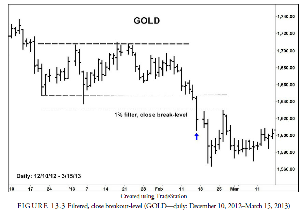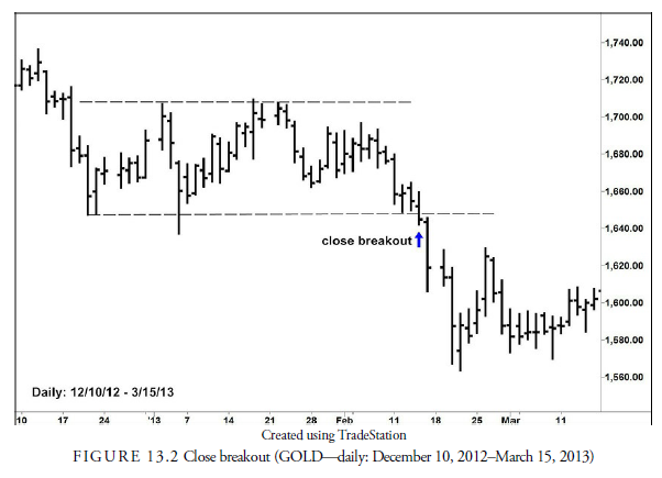 Rather than looking simply at price, this method looks at time since the penetration. The basis is that if the penetration remains outside the breakout zone for a certain time, it must be real. The usual time period is two bars, but it can be any length of time. The price must remain beyond, or at least close beyond, the breakout level for the required number of bars. A combination of the time rule and the close rule uses both rules. This method requires a penetration and close beyond the breakout level, and then a second bar in which the price penetrates even further beyond the breakout level. For example, in a breakout down, the close must be below the breakout level, and the next bar must have a trade below the previous bar’s low for confirmation of the breakout down. Figure 13.3 qualifies as a two-bar breakout with or without the filter or close constraint.