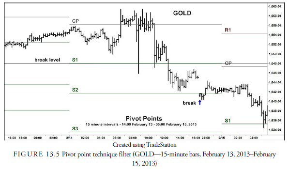 The pivot point technique is a method of determining likely support and resistance levels. It is widely used by day traders to establish potential price ranges for the day and rarely used as confirmation for breakouts (see Figure 13.5).