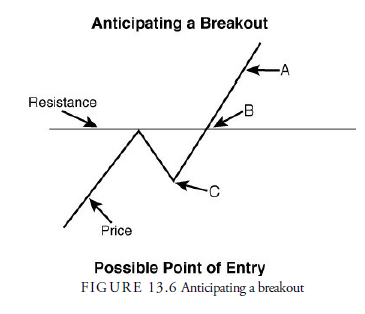 So far, we have looked at ways of confirming a breakout after it has occurred. Is it possible to determine that a breakout is about to occur before it actually does? Sometimes it is possible to anticipate a breakout. Often, volume is a clue that a breakout is about to occur. As we will learn later, volume often accompanies the trend. In other words, an increase in volume with a trend is supportive of that trend. Thus, when prices are oscillating, for example, beneath a resistance zone and volume increases on every small up leg and decreases with every small down leg, the odds favor that the price will eventually break up through the resistance zone because the increased volume expresses increased interest on the buy side.