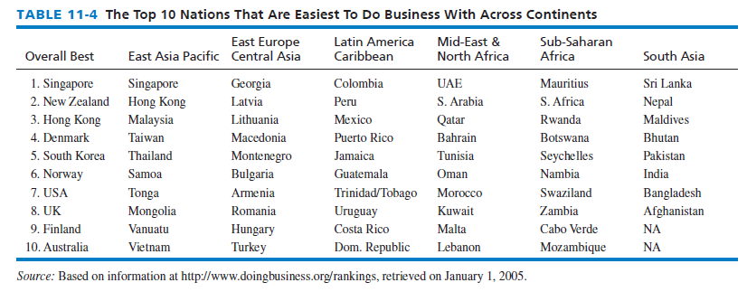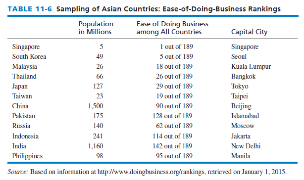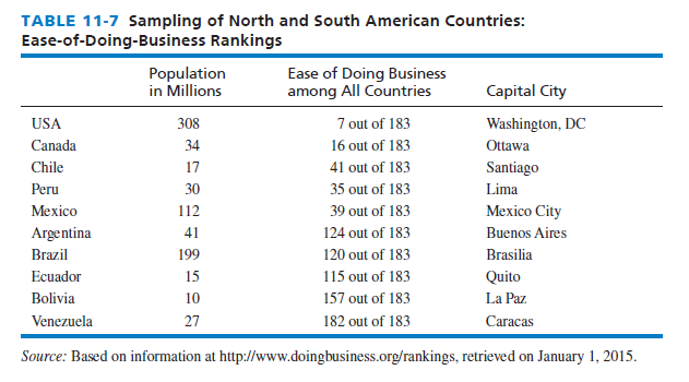 Table 11-4 reveals the 2014 “Ease of Doing Business” rankings for the top 10 nations in six regions of the world. Note, for example, that Norway is rated the sixth best country on the planet for doing business, the United States is ranked seventh, and Colombia is the best country in South America. This information can be helpful for strategists (and students) deciding where to locate new operations, and where to focus new efforts.