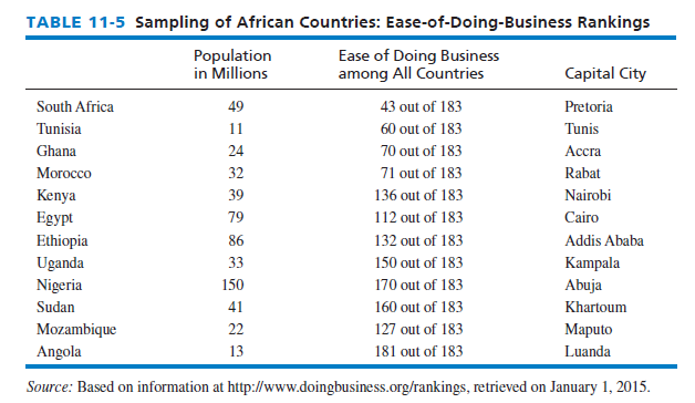 Table 11-5 provides a summary of the economic situation in 12 African countries. Note that Angola is rated lowest in terms of doing business, whereas South Africa is rated highest. Recent regime changes in Egypt, Tunisia, Libya, and Algeria may spur further investment in Africa as democracy and capitalism strengthens. Many multinational companies are now gaining first mover advantages by engaging Africa at all levels. Today, 40 percent of Africans live in the cities—a proportion close to China and India. The general stereotype of Africa is rapidly changing from subsistence farmers avoiding lions to millions of smartphone-carrying consumers in cities purchasing products.
