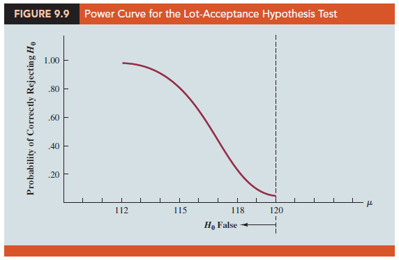 In this section we show how to calculate the probability of making a Type II error for a hypothesis test about a population mean. We illustrate the procedure by using the lot- acceptance example described in Section 9.6. The null and alternative hypotheses about the mean number of hours of useful life for a shipment of batteries are H0: μ ≥ 120 and Ha: μ ≤ 120. If H0 is rejected, the decision will be to return the shipment to the supplier because the mean hours of useful life are less than the specified 120 hours. If H0 is not rejected, the decision will be to accept the shipment.