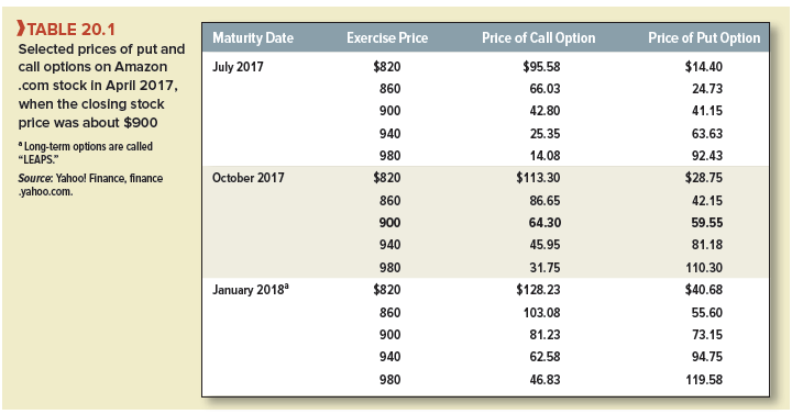 Investors regularly trade options on common stocks.[1] For example, Table 20.1 reproduces quotes for options on the stock of Amazon.com. You can see that there are two types of options—calls and puts. We explain each in turn.