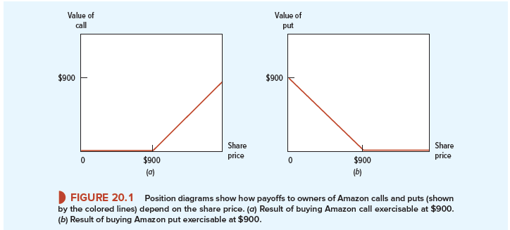 Option analysts often draw a position diagram to illustrate the possible payoffs from an option. For example, the position diagram in Figure 20.1a shows the possible consequences of investing in Amazon October 2017 call options with an exercise price of $900 (boldfaced in Table 20.1). The outcome from investing in Amazon calls depends on what happens to the stock price. If the stock price at the end of this six-month period turns out to be less than the $900 exercise price, it will not make sense to pay the exercise price to obtain the share. Your call will, in that case, be worthless. On the other hand, if the stock price turns out to be greater than $900, it will pay to exercise your option to buy the share. In this case, when the call expires, it will be worth the market price of the share minus the $900 that you must pay to exercise the option. For example, suppose that the price of Amazon stock rises to $980. Your call will then be worth $980 – $900 = $80. That is your payoff, but of course, it is not all profit. Table 20.1 shows that you had to pay $64.30 to buy the call.