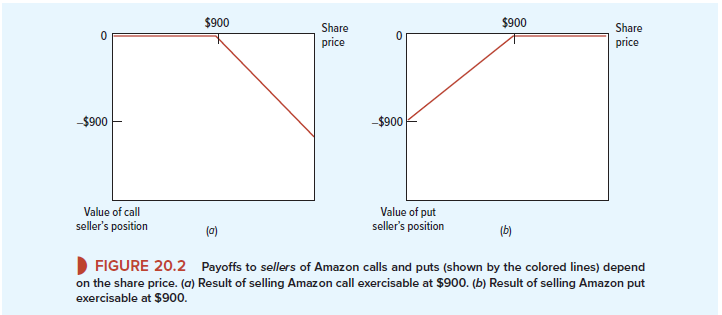 Suppose that the price of Amazon stock turns out to be $980, which is above the option’s exercise price of $900. In this case, the buyer will exercise the call. The seller is forced to sell stock worth $980 for only $900 and so has a payoff of – $80.4 Of course, that $80 loss is the buyer’s gain. Figure 20.2a shows how the payoffs to the seller of the Amazon call option vary with the stock price. Notice that for every dollar the buyer makes, the seller loses a dollar. Figure 20.2a is just Figure 20.1a drawn upside down.