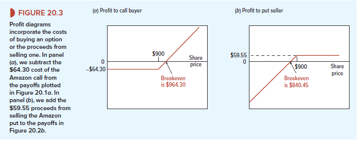 This is a common point of confusion. For example, the position diagram in Figure 20.1a makes purchase of a call look like a sure thing—the payoff is at worst zero, with plenty of upside if Amazon’s stock price goes above $900 by October 2017. But compare the profit diagram in Figure 20.3a, which subtracts the $64.30 cost of the call in April 2017 from the payoff at maturity. The call buyer loses money at all share prices less than $900 + 64.30 = $964.30. Take another example: The position diagram in Figure 20.2b makes selling a put look like a sure loss—the best payoff is zero. But the profit diagram in Figure 20.3b, which recognizes the $59.55 received by the seller, shows that the seller gains at all prices above $900 – 59.55 = $840.45.[3]