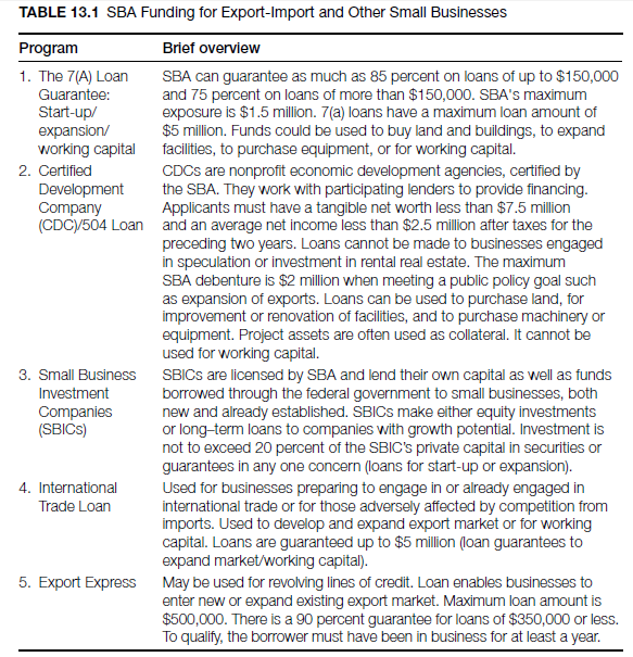 The SBA has several facilities for lending that can be used by export-import businesses for capital needs at different stages of their growth cycle (see Table 13.1).