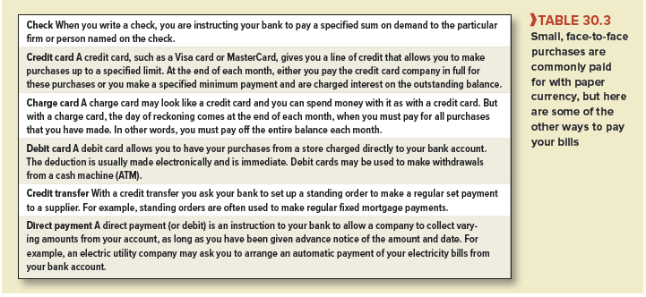 Many small, face-to-face purchases are made with paper currency. But you probably would not want to use cash to buy a new car, and you can’t use cash to make a purchase over the Internet. There are a variety of ways that you can pay for larger purchases or send payments to another location. Some of the more important ways are set out in Table 30.3.