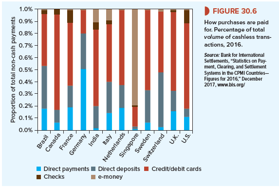 Look now at Figure 30.6. You can see that there are large differences in the ways that people around the world pay for their purchases. For example, checks are almost unknown in Germany, the Netherlands, and Sweden.[1] Most payments in these countries are by debit card or credit transfer. By contrast, Americans love to write checks. Each year individuals and firms in the United States write about 12 billion checks.