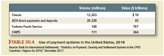Large-value payments between companies are usually made electronically through Fed- wire or CHIPS. Fedwire is operated by the Federal Reserve system and connects more than 6,000 financial institutions to the Fed and, thereby, to each other.[5] CHIPS is a bank-owned system. It mainly handles eurodollar payments and foreign exchange transactions and is used for more than 95% of cross-border payments in dollars. Table 30.4 shows that the number of payments by Fedwire and CHIPS is relatively small, but the sums involved are huge.
